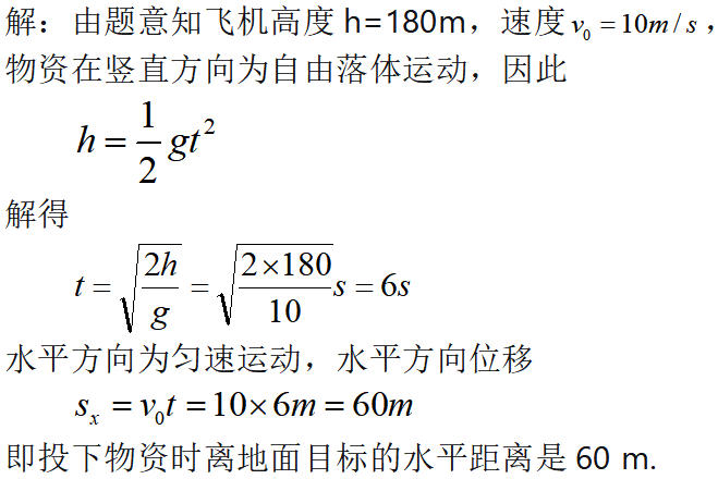 6、一架准备空投物资的直升飞机,距地面180 m高,以10 m/s的速度水平飞行,要使物资能准确投放到地面目标,则它投下物资时离地面目标的水平距离是多少?(不计空气阻力,g取10 m/s